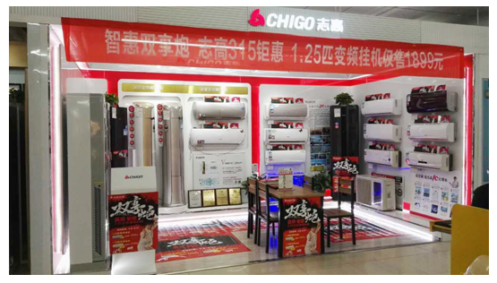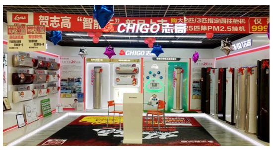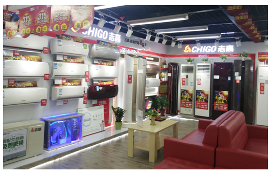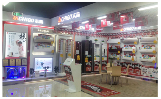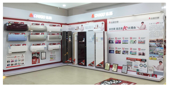 2015年,首批采用新SI终端形象规范门店之一的志高空调佛山三水旗舰店盛装开业,引入代言人成龙形象元素后,其装修、布局、风格焕然一新,店内展示的空调款式齐全,每一个细节均传递志高“高端空调引领者”风范,同时为全国终端门店形象的更新提供了重要的参考依据。