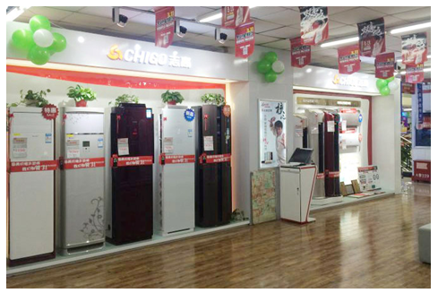 在终端门店的装修设计上,一方面,志高将独具特色的代言人元素、企业元素、企业文化、标准色彩等要素融入到其中,方便顾客更加直接、更加深入地了解企业产品和精神文化。