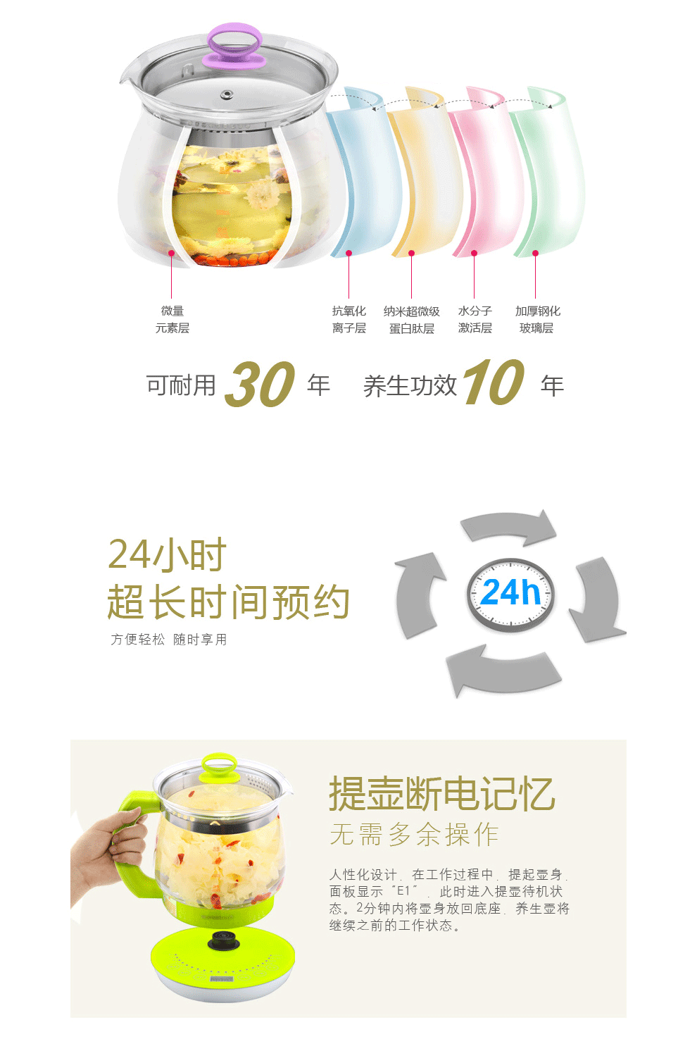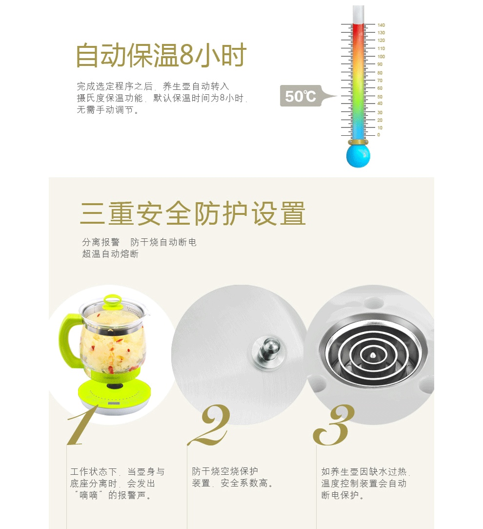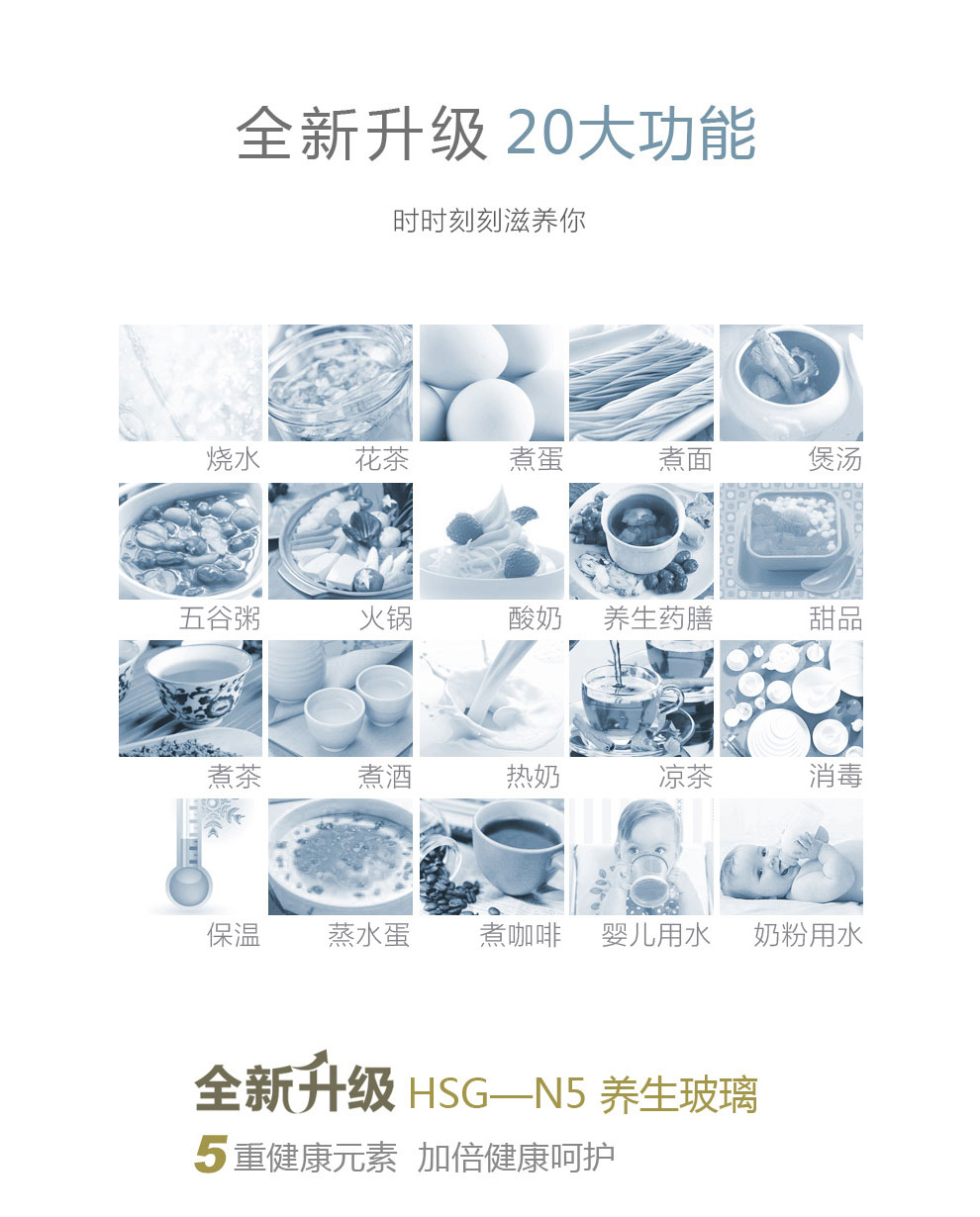 可烧开水、煮咖啡、煲药膳、做酸奶、煮面条、煮甜品、煲粥、煮花茶、蒸鸡蛋
